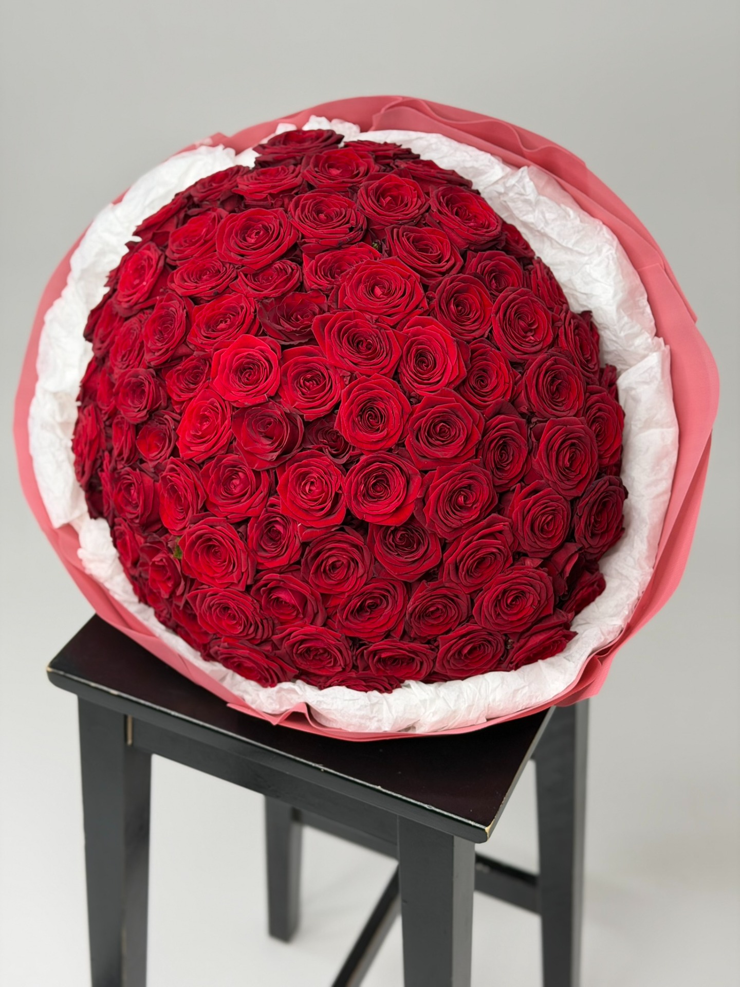 Luxusní valentýnská kytice ze 101 vybraných růží, ručně vázaná do maximálně bohatého tvaru.