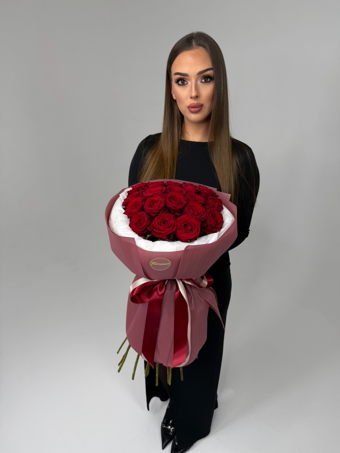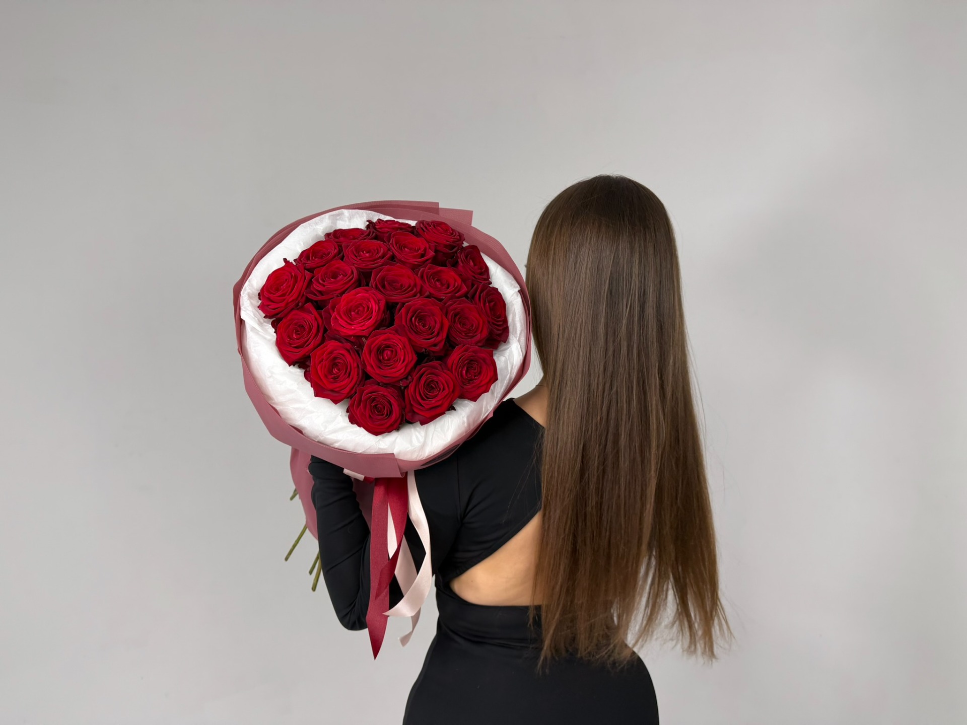 Valentýnská kytice z 21 vybraných růží, ručně vázaná, elegantně zabalená.