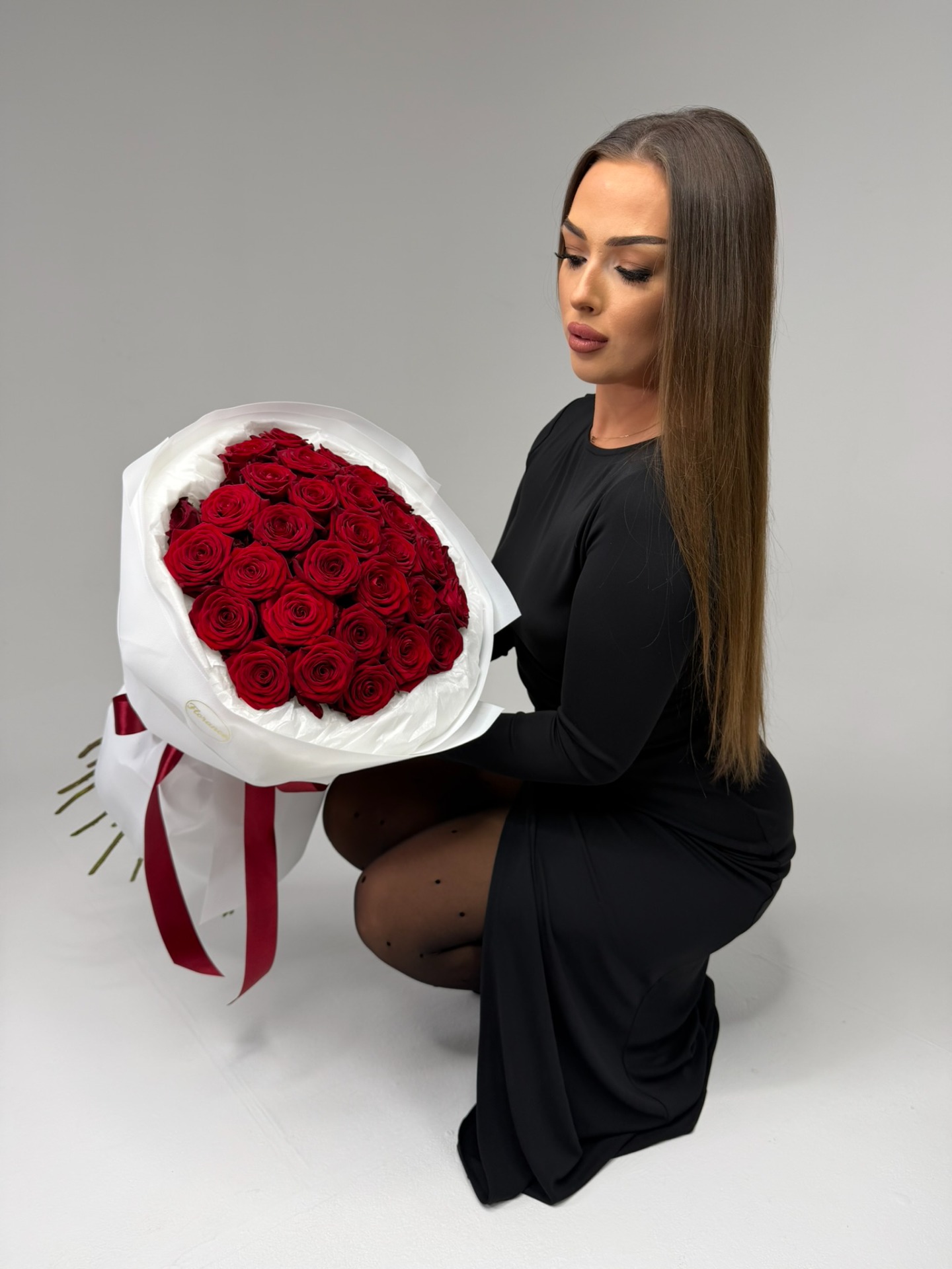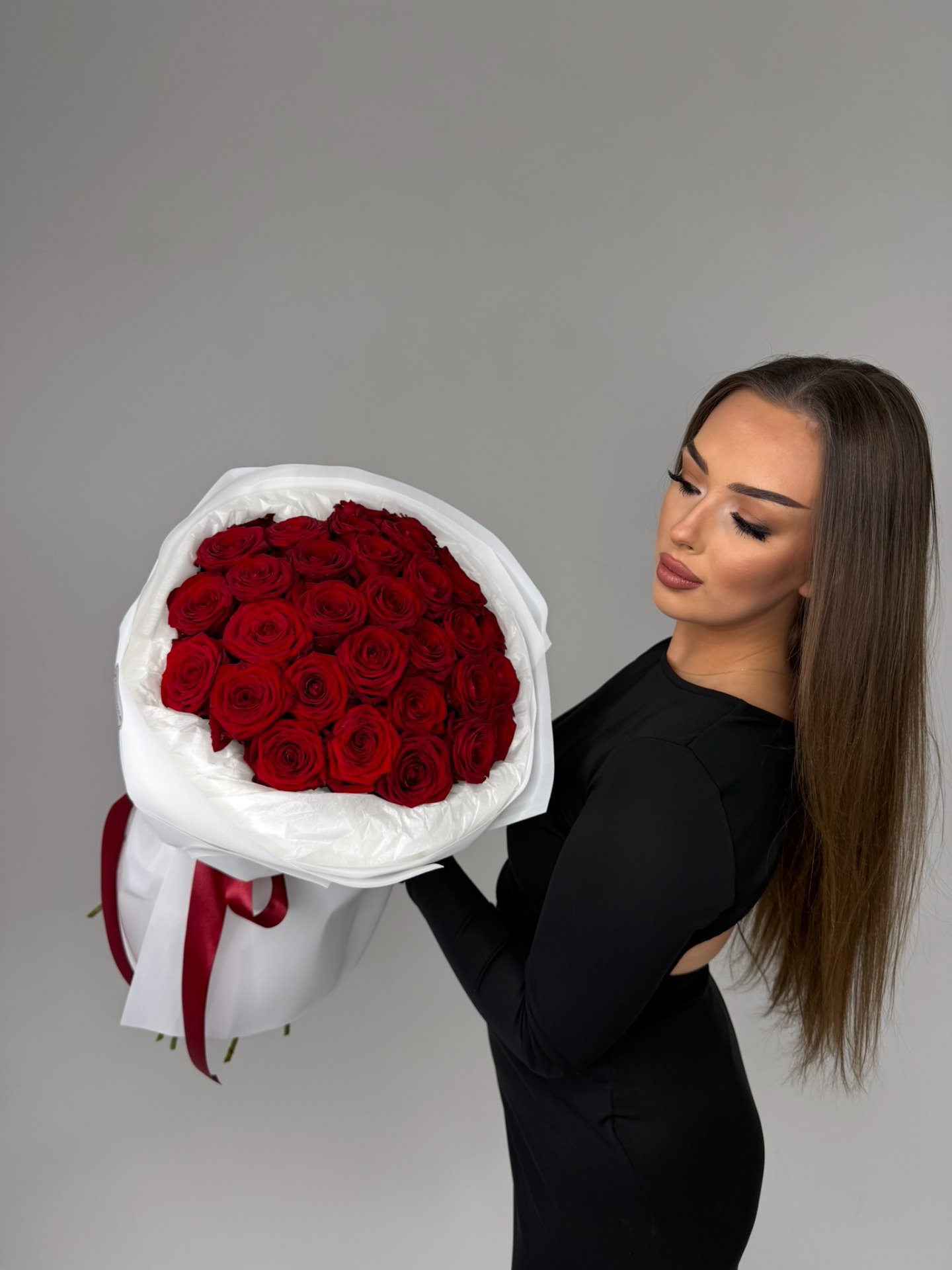Valentýnská kytice z 31 vybraných růží, ručně vázaná, elegantně zabalená.