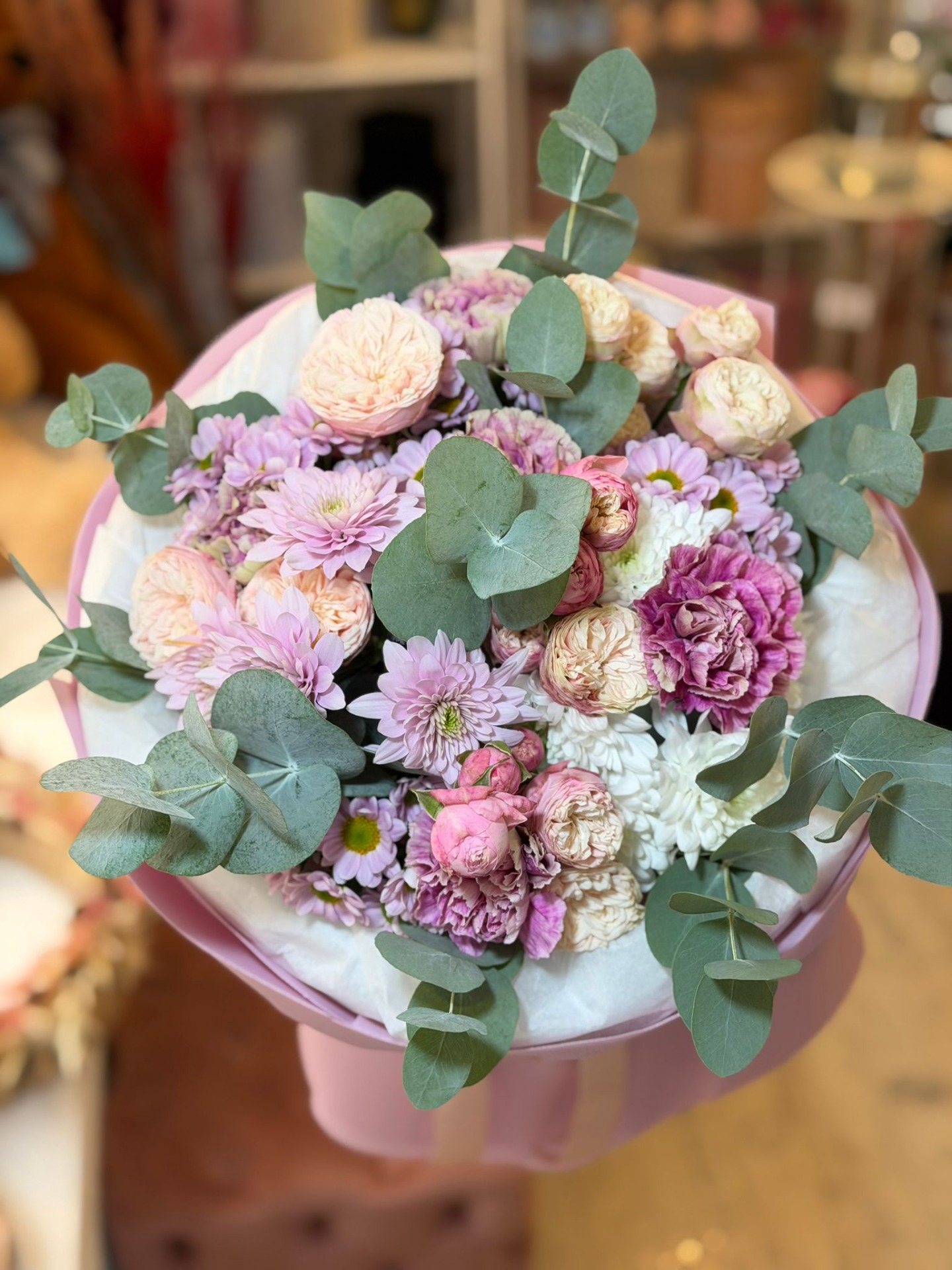 Jemná kytice v pastelových lila tónech doplněná o eukalyptus. Elegantní volba pro každou příležitost.