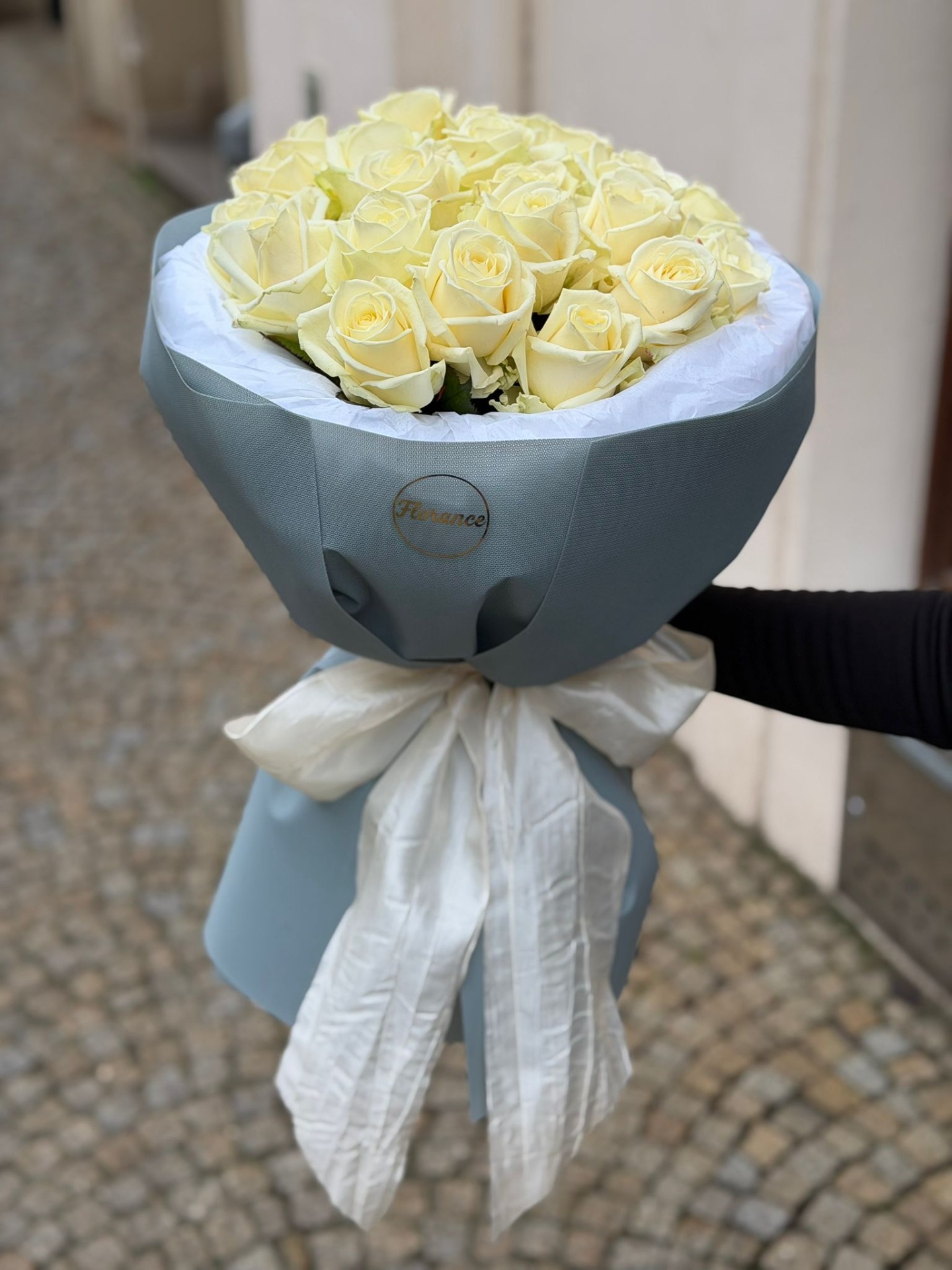 Kytice z bílých růží působí jemně, elegantně a nadčasově. Bílá barva symbolizuje čistotu, upřímnost a nový začátek, díky čemuž je tato kytice vhodná k narozeninám, svatbám, výročí, poděkování i jako citlivé gesto. Přirozená krása růží vyniká v jednoduché a harmonické vazbě, která potěší při každé příležitosti.
